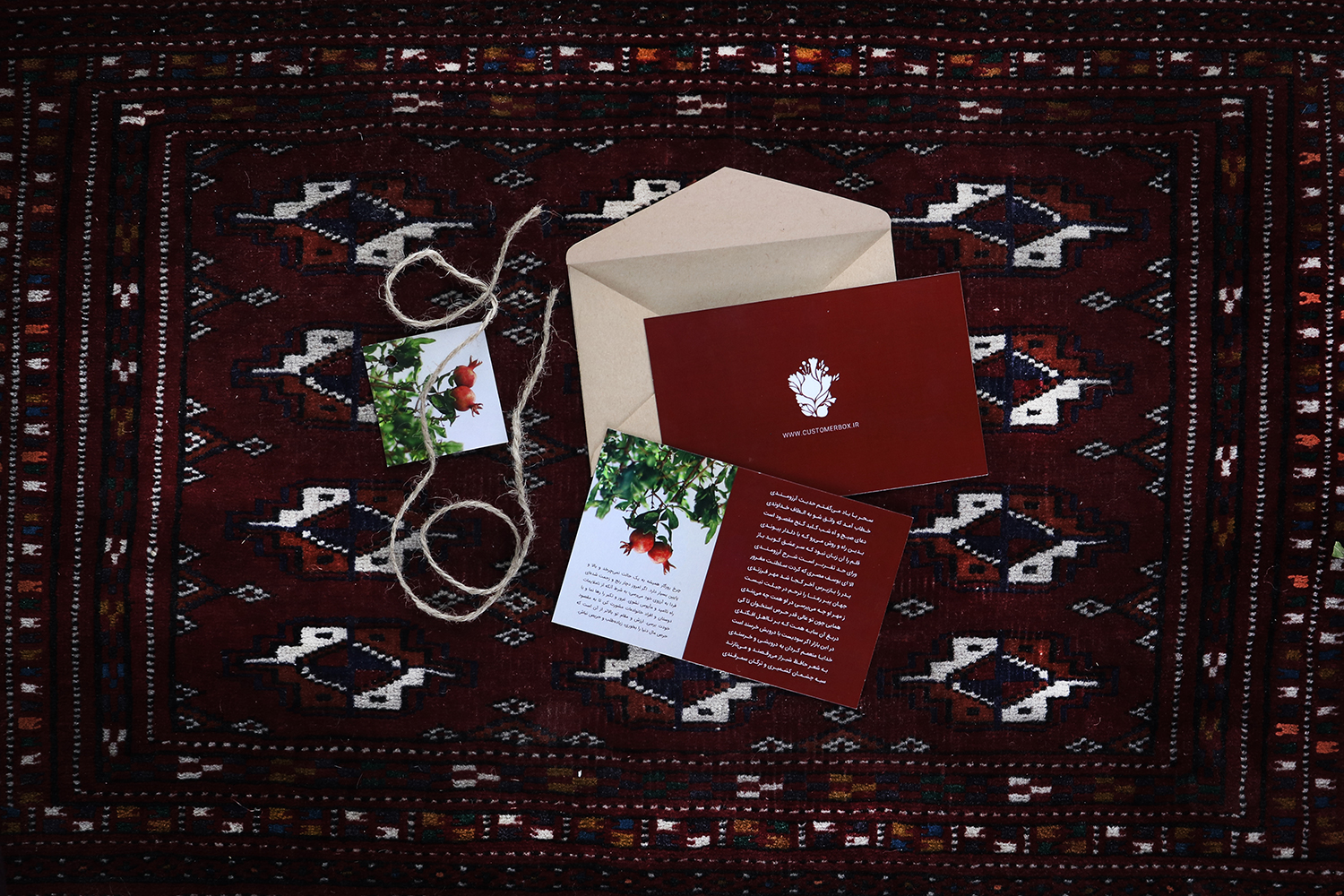 کارتفال ناردانه همراه با پاکت ارائه میشود. اندازه آن 9.5 در 14.5 سانتیمتر است و امکان درج نشان کسب و کار شما بر روی آن محیاست.
